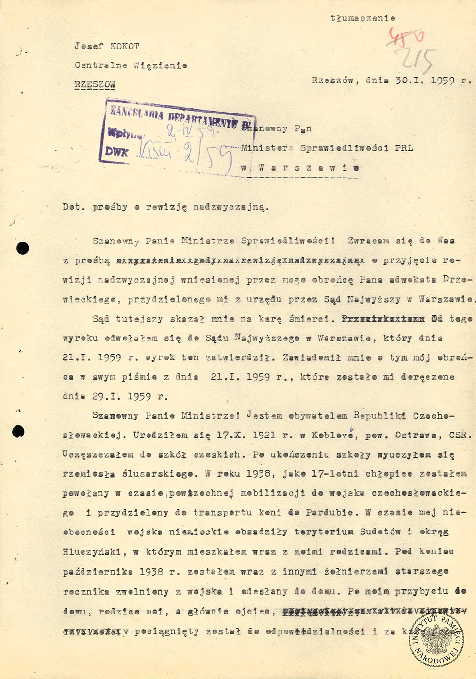 Prośba Józefa Kokotta o rewizję nadzwyczajną do Ministra Sprawiedliwości PRL z 1959 r.