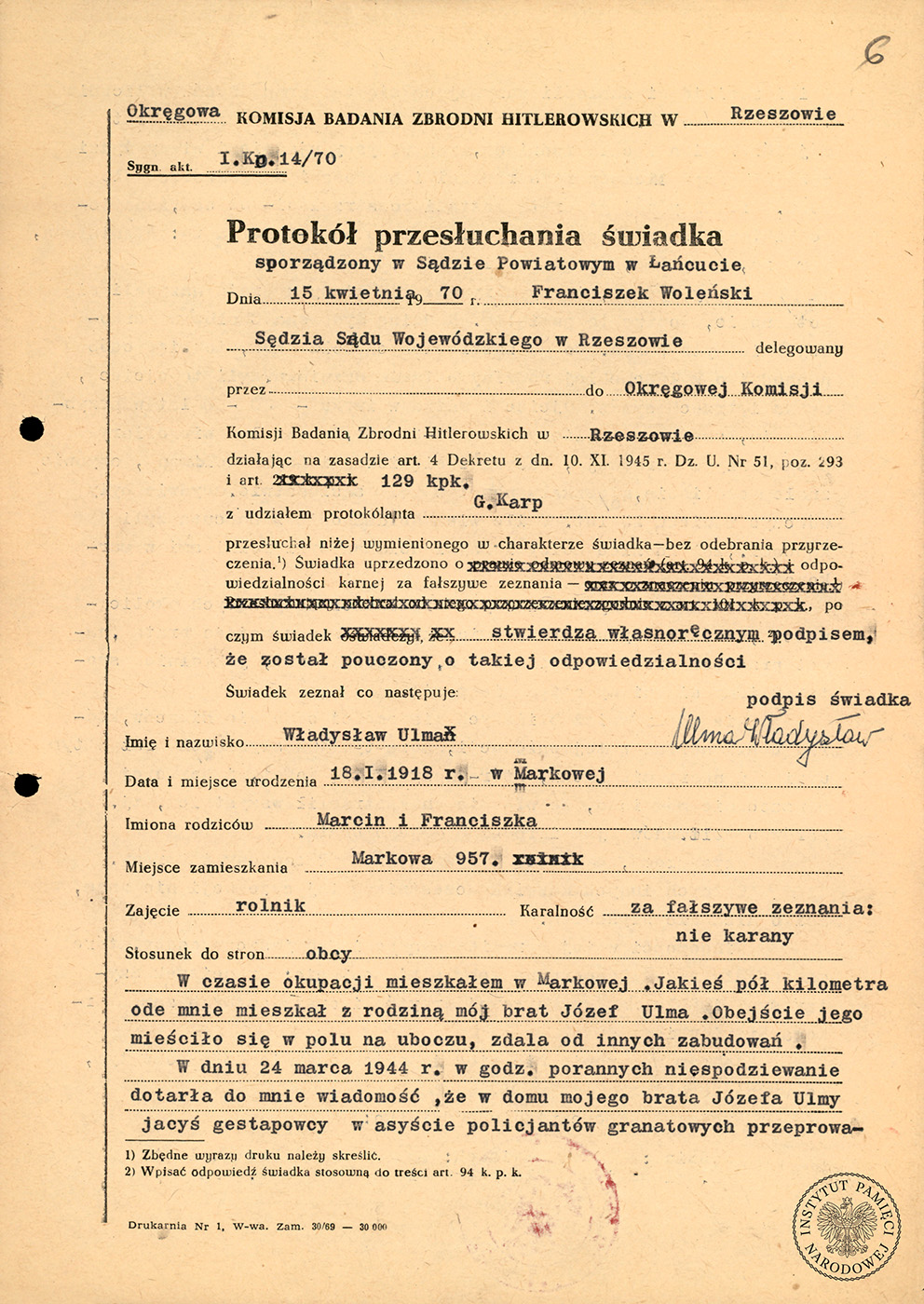 Prezentujemy skan protokołu przesłuchania Władysława Ulmy – brata Józefa – przez Okręgową Komisję Ścigania Zbrodni przeciwko Narodowi Polskiemu w Rzeszowie. Dokument został sporządzony w Sądzie Powiatowym w Łańcucie 15 kwietnia 1970 roku.