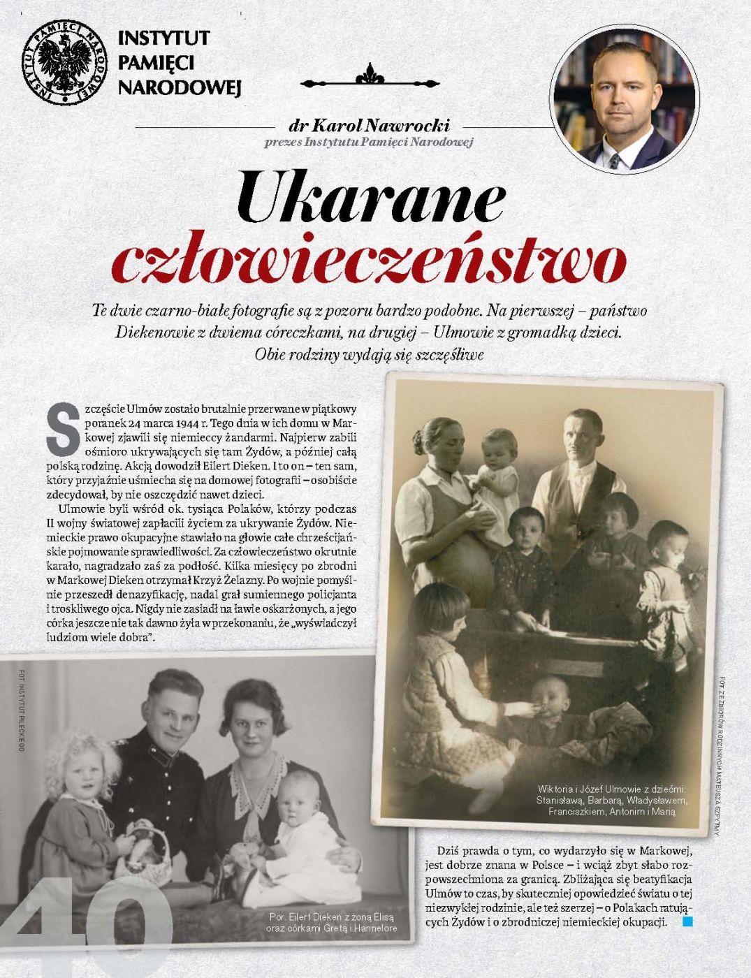 Te dwie czarno-białe fotografie są z pozoru bardzo podobne. Na pierwszej – państwo Diekenowie z dwiema córeczkami, na drugiej – Ulmowie z gromadką dzieci. Obie rodziny wydają się szczęśliwe... - dr Wojciech Hanus, OBBH IPN w Rzeszowie, „Ratując życie innych, złożyli w ofierze własne…” Rodzina Ulmów z Markowej