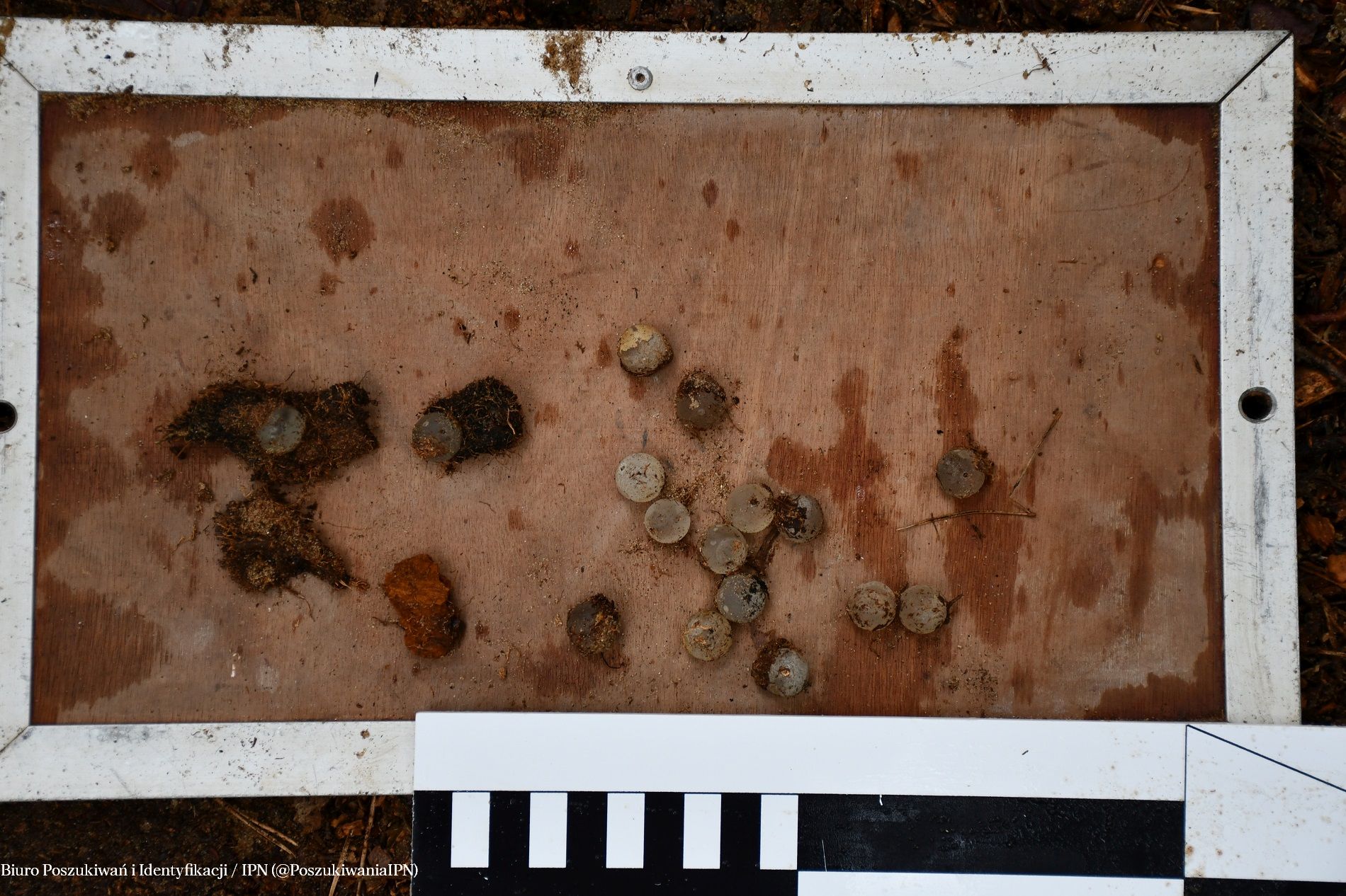 Przy szczątkach odnaleziono liczne artefakty: buty lub ich pozostałości, pasek skórzany, guziki, korale, bransoletkę, spinkę do mankietu. Na dnie jamy grobowej ujawniono jeden pocisk.
